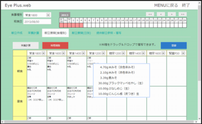 栄養量は、1日・食区・料理・食品別に計算可能です。